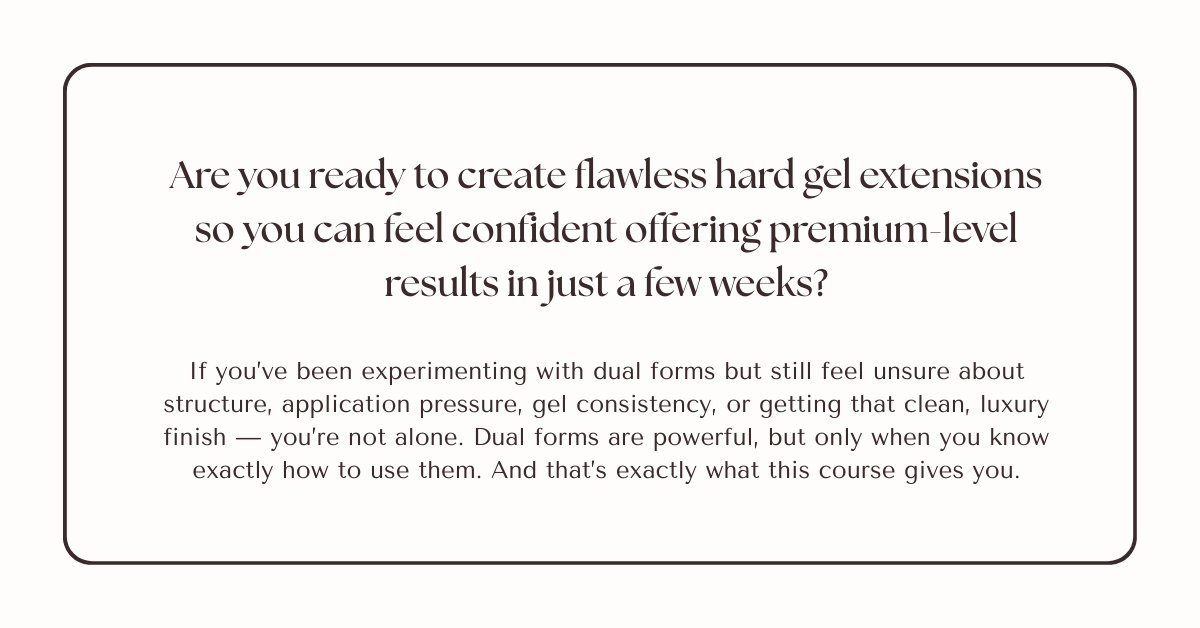 Learn which tools, products, and equipment you need to confidently work with dual forms. This course is brand-inclusive, so no matter which gel you use, I’ll guide you every step of the way.